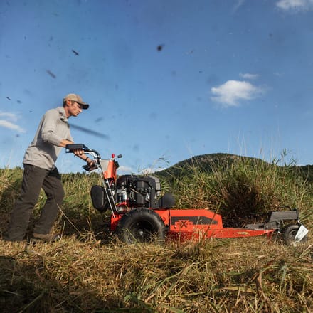 Never flat folding caster wheels hold the weight of the 36″ deck for long mowing sessions and can be flipped back to tackle brush and tougher vegetation.